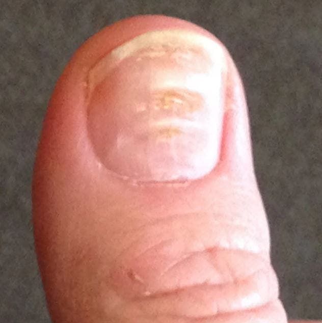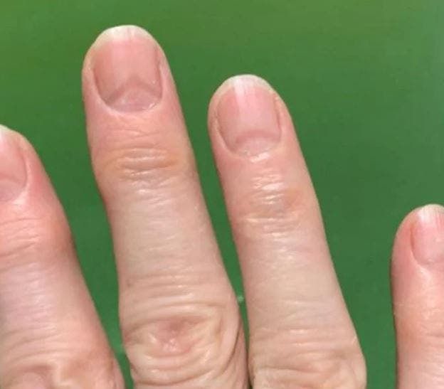 وأحد الأعراض هو ظهور شكل نصف قمر أحمر على شكل شريط محدب فوق المنطقة البيضاء عند قاعدة الأظافر.