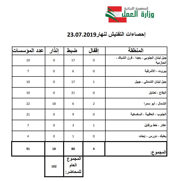 وأوضح المكتب، في بيان، أن “التفتيش شمل 12 منطقة ليوم الثلثاء 23 تموز 2019، وهي: بعبدا، فرن الشباك، الحازمية، الاشرفية، جبيل، تعنايل، ابو سمرا، برقايل، العاقبية، السكسكية، دورس وإيعات”، وأضافت: “زار المفتشون 91 مؤسسة ومحلًا. ولوحظ أن عددًا كبيرًا منها بدأ استبدال عماله غير الشرعيين بعمال لبنانيين وبالاستحصال على إجازات عمل للاجانب الذين يسمح لهم القانون بذلك”.