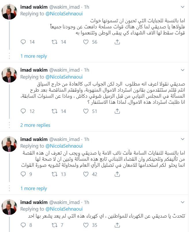 فردّ واكيم على تغريدة صحناوي قائلا: “صديقي نقولا أعرف أنه مطلوب الرد لكن الجواب أتى كالعادة من خارج السياق. أنتم قلتم ستتقدمون بقانون استرداد الأموال المنهوبة وأوقفتم المناقصة بعد طرح المسألة في المجلس النيابي من قبل الزميل شوقي دكاش، وماذا عن السنوات السابقة، أنا طلبت استرداد هذه الأموال. لماذا هذا الاستنفار؟”.