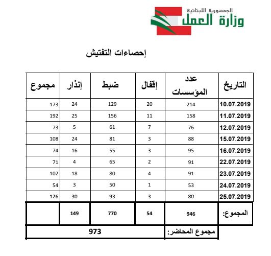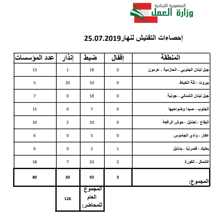 استكملت فرق التفتيش في وزارة العمل عملها بخطة تنظيم اليد العاملة الأجنبية التي أطلقها الوزير كميل أبو سليمان، وشملت الخميس مناطق الحازمية وعرمون وتلة الخياط وجونية وصيدا وتعنايل وحوش الرافعة ووادي الجاموس والكورة وقصرنبا وبدنايل.