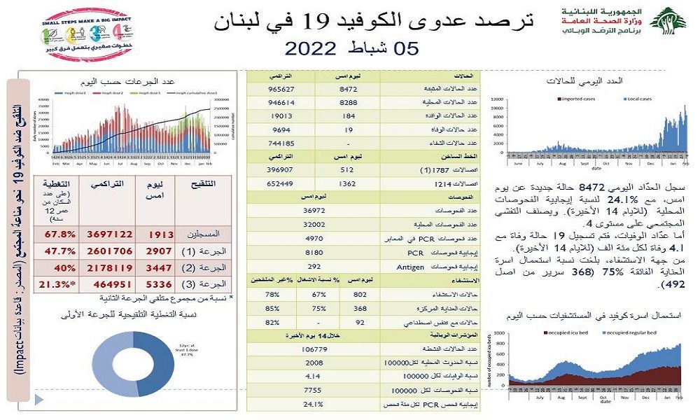 أعلنت وزارة الصحة العامة في تقريرها اليومي تسجيل 8472 إصابة جديدة بفيروس كورونا رفعت العدد التراكمي للحالات المثبتة الى 965627، كما تم تسجيل 19 حالة وفاة.
