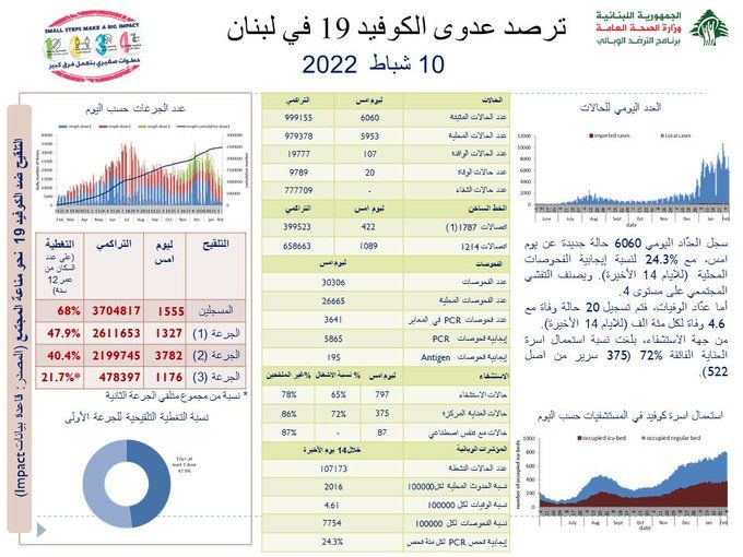 أعلنت وزارة الصحة العامة في تقريرها اليومي تسجيل “6060 إصابة جديدة بفيروس كورونا رفعت العدد التراكمي للحالات المثبتة الى 999155، كما تم تسجيل 20 حالة وفاة”.