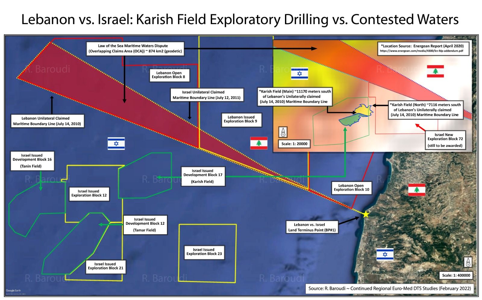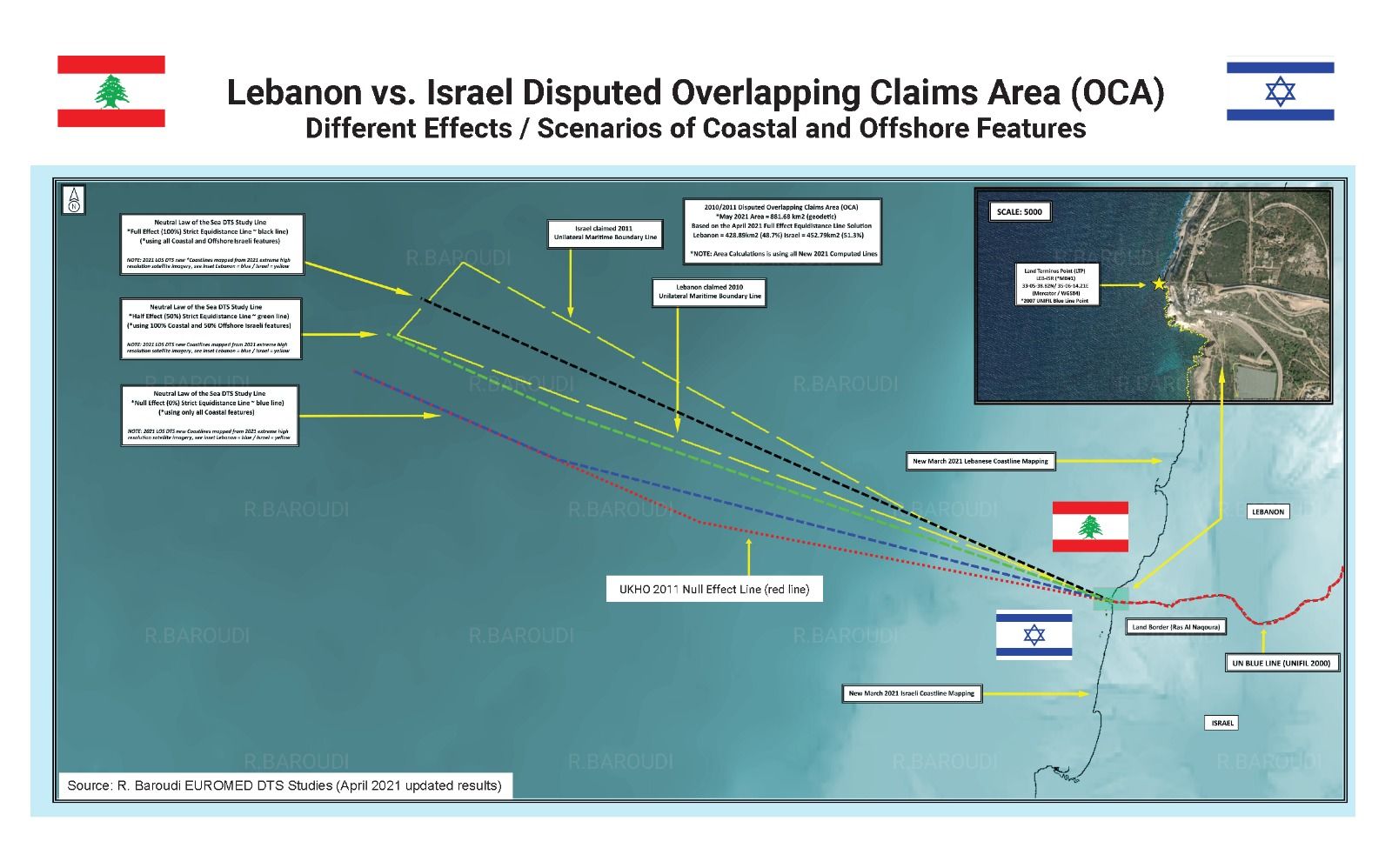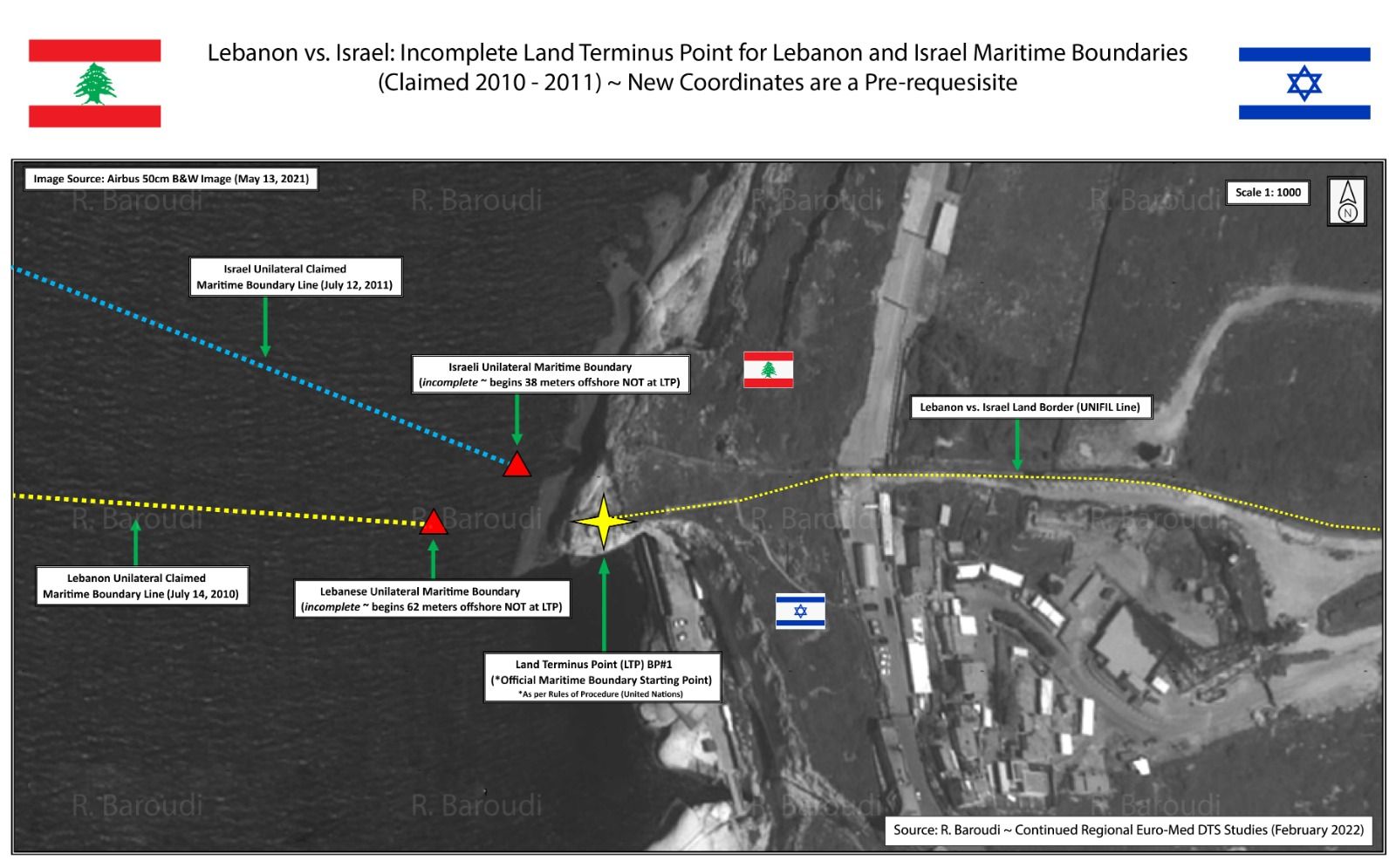 ويُلفت إلى أن “إسرائيل اعتمدت في العام 2011 خطاً يبدأ من مسافة 34 متراً من الشاطئ عند نقطة رأس الناقورة، وأبلغت الأمم المتحدة بالأمر… لكن في نهاية المطاف، تُعتبر المعطيات التي تم الاستناد إليها لرسم هذين الخطّيْن، هي معطيات خاطئة يجب تصحيحها”، ويُضيف: لا بدّ من الإشارة هنا، أن في العامين 2010 و2011 لم تكن تقنيّة GPS بالتطوّر ذاته كما هي اليوم، ما تطلّب تصحيح الإحداثيّات البحريّة الخاطئة، والخريطة المُرفَقة التي تُنشَر للمرة الأولى، تُظهِر بشكل واضح الأخطاء المُرتَكَبة من البلدين والتي يجب تصحيحها”.
