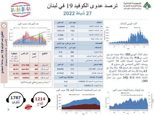 أعلنت وزارة الصحة العامة تسجيل 1533 إصابة جديدة بفيروس كورونا في لبنان، ما يرفع العدد الإجمالي للمصابين إلى 1066840. كما أعلنت تسجيل 10 وفيات جديدة بالفيروس ترفع الحصيلة الإجمالية للمتوفين إلى 10079.