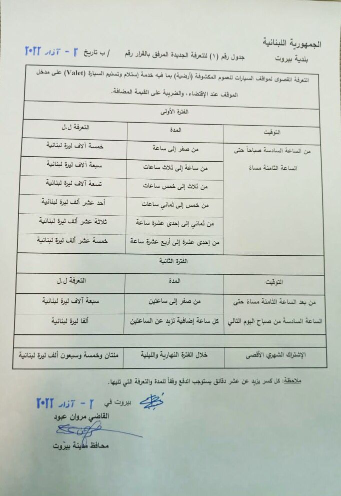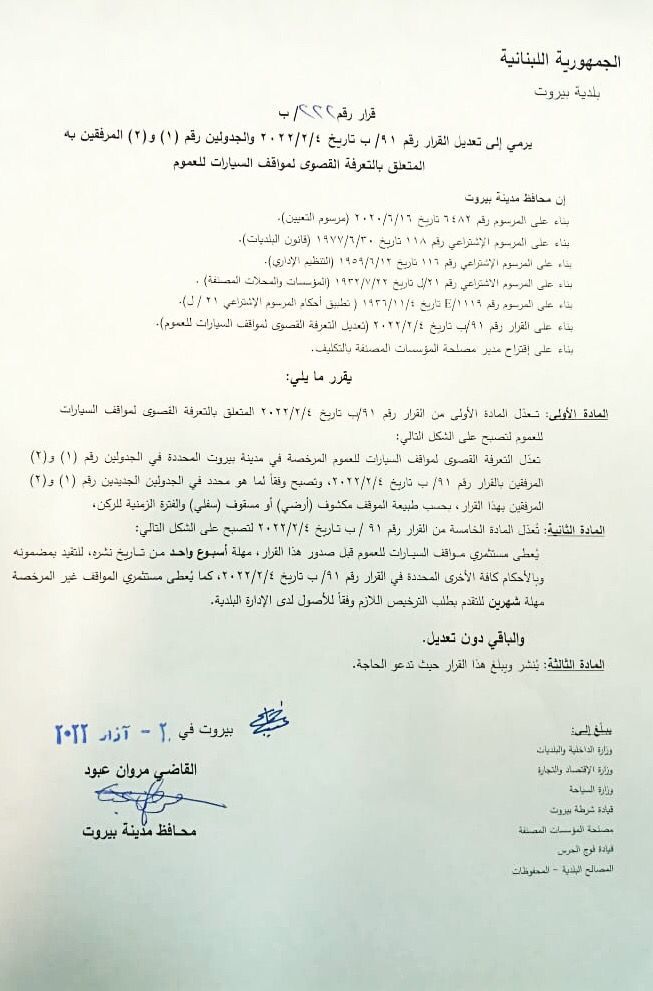 أصدر محافظ مدينة بيروت القاضي مروان عبود قراراً حمل الرقم 222/ب ، يرمي إلى تعديل القرار رقم 91/ ب تاريخ 4/2/2022 والجدولين رقم (1) و(2) المرفقين به المتعلق بالتعرفة القصوى لمواقف السيارات للعموم ضمن نطاق مدينة بيروت.