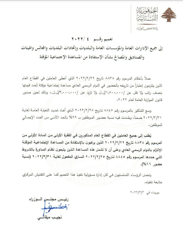 أصدر رئيس مجلس الوزراء نجيب ميقاتي، اليوم الخميس، تعميما يتعلق بموضوع المساعدات الاجتماعية المؤقتة التي ستعطى للعاملين في القطاع العام.