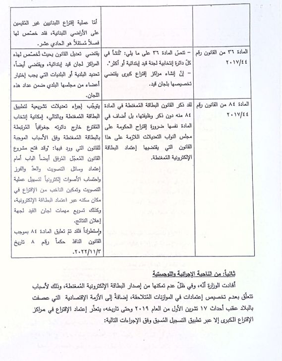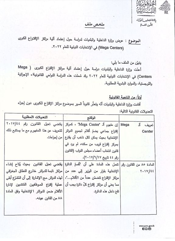 قدمت وزارة الداخلية والبلديات دراسة حول اعتماد آلية مراكز الاقتراع الكبرى (Mega Centers) في الانتخابات النيابية للعام 2022، وشملت هذه الدراسة النواحي القانونية، الاجرائية واللوجستية، والموارد البشرية المطلوبة،