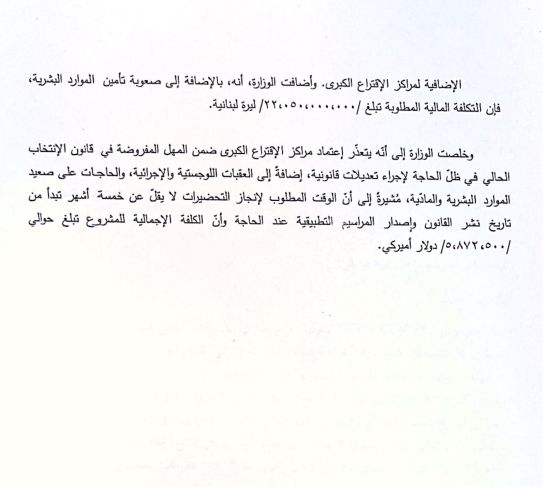 وأشارت الوزارة إلى أن “الدراسة التي طلبها رئيس الحكومة نجيب ميقاتي من الوزارة بعد رسالة من رئيس الجمهورية ميشال عون، خلُصت إلى أنه يتعذّر اعتماد مراكز الاقتراع الكبرى ضمن المهل المفروضة في قانون الانتخاب الحالي في ظل الحاجة لاجراء تعديلات قانونية، إضافة إلى العقبات اللوجستية والاجرائية، والحاجات على صعيد الموارد البشرية والمادية”، لافتة إلى أن “الوقت المطلوب لانجاز التحضيرات لا يقلّ عن خمسة أشهر تبدأ من تاريخ نشر القانون وإصدار المراسيم التطبيقية عند الحاجة، وأنّ الكلفة الاجمالية للمشروع تبلغ حوالي 5،872،500 دولار أميركي”.