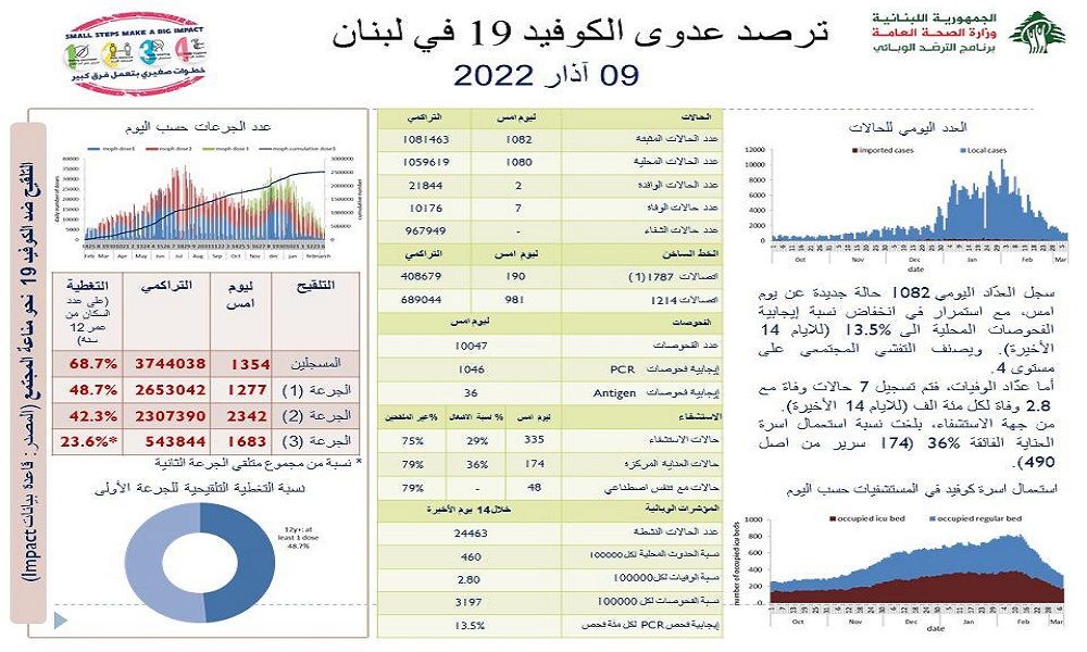 أعلنت وزارة الصحة العامة في تقريرها اليومي تسجيل 1082 إصابة جديدة بفيروس كورونا رفعت العدد التراكمي للحالات المثبتة الى 1081463، كما تم تسجيل 7 حالات وفاة.
