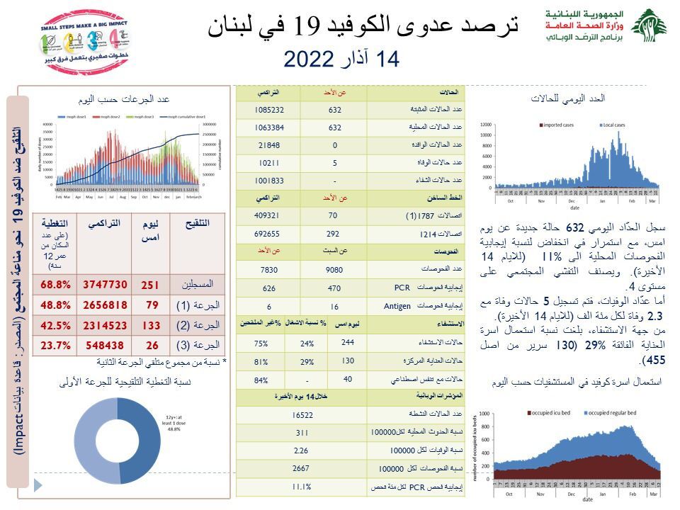 أعلنت وزارة الصحة العامة تسجيل 632 إصابة جديدة بفيروس “كورونا” في لبنان، ما يرفع العدد الإجمالي للمصابين إلى 1085232. كما أعلنت تسجيل 5 حالات وفاة جديدة بالفيروس ترفع الحصيلة الإجمالية للمتوفين إلى 10211.
