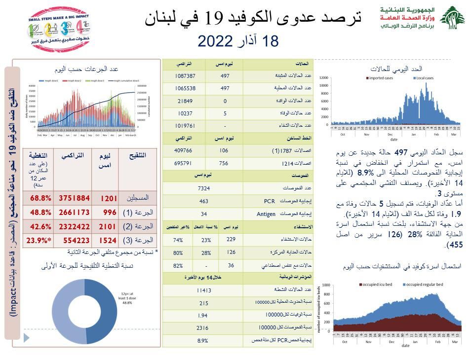 أعلنت وزارة الصحة العامة تسجيل 497 إصابة جديدة بفيروس “كورونا” في لبنان، ما يرفع العدد الإجمالي للمصابين إلى 1087387. كما أعلنت تسجيل 5 حالات وفاة جديدة بالفيروس ترفع الحصيلة الإجمالية للمتوفين إلى 10237.
