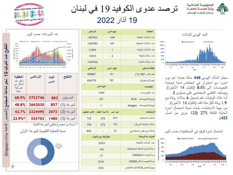 أعلنت وزارة الصحة العامة في تقريرها اليومي تسجيل “448 إصابة جديدة بفيروس كورونا رفعت العدد التراكمي للحالات المثبتة الى 1087835، كما تم تسجيل 6 حالات وفاة”.