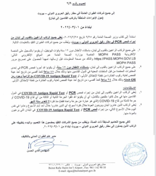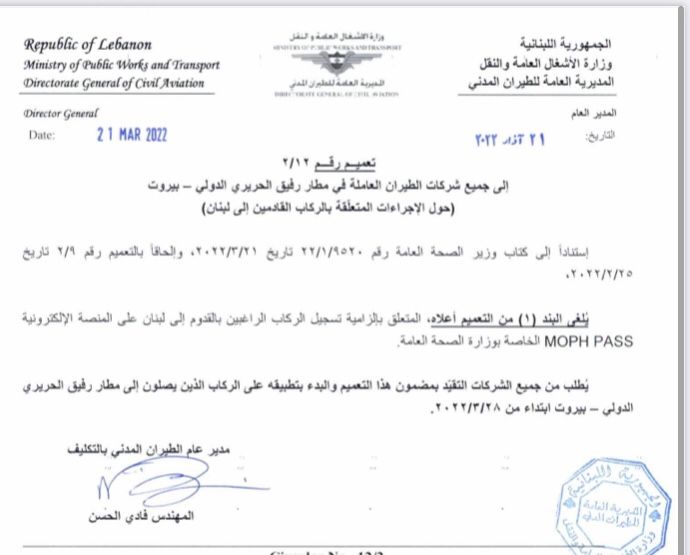 أصدرت المديرية العامة للطيران المدني تعميمًا إلى كل شركات الطيران وشركات الخدمة الأرضية العاملة في مطار رفيق الحريري الدولي حول الإجراءات المتعلقة بالركاب القادمين إلى لبنان إبتداءً من 28/03/2022.