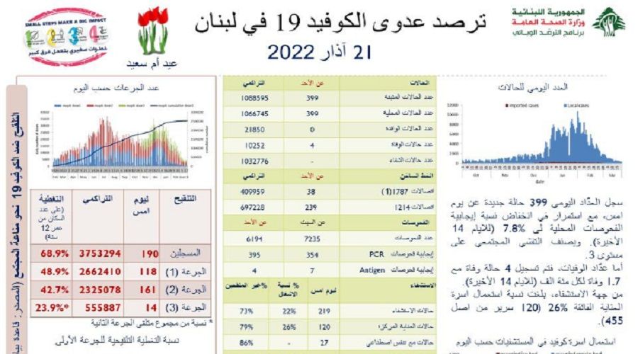 أعلنت وزارة الصحة العامة في تقريرها اليومي تسجيل 399 إصابة جديدة بفيروس كورونا رفعت العدد التراكمي للحالات المثبتة الى 1088595، كما تم تسجيل 4 حالات وفاة.