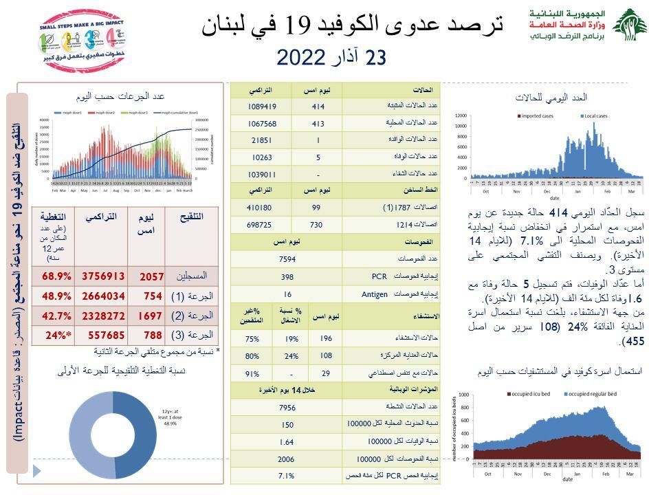 أعلنت وزارة الصحة العامة تسجيل 414 إصابة جديدة بفيروس “كورونا” في لبنان، ما يرفع العدد الإجمالي للمصابين إلى 1089414. كما أعلنت تسجيل 5 حالات وفاة جديدة بالفيروس ترفع الحصيلة الإجمالية للمتوفين إلى 10263.