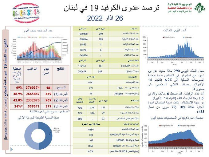أعلنت وزارة الصحة العامة تسجيل 290 إصابة جديدة بفيروس كورونا في لبنان، ما يرفع العدد الإجمالي للمصابين إلى 1090498. كما أعلنت تسجيل 6 وفيات جديدة بالفيروس ترفع الحصيلة الإجمالية للمتوفين إلى 10278.