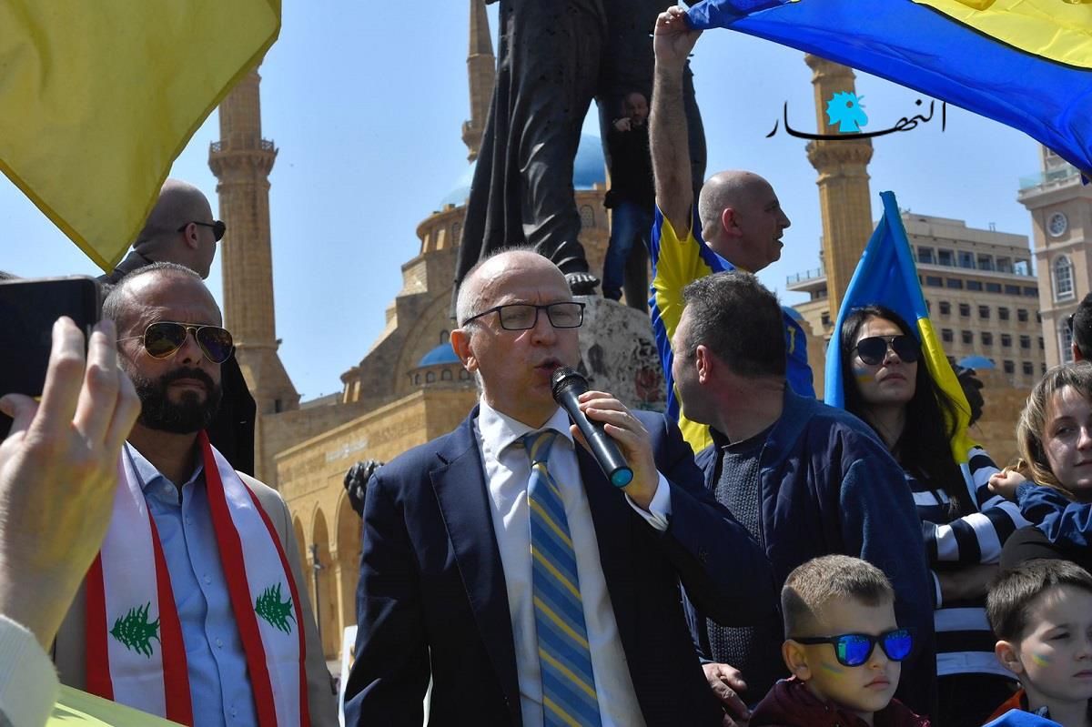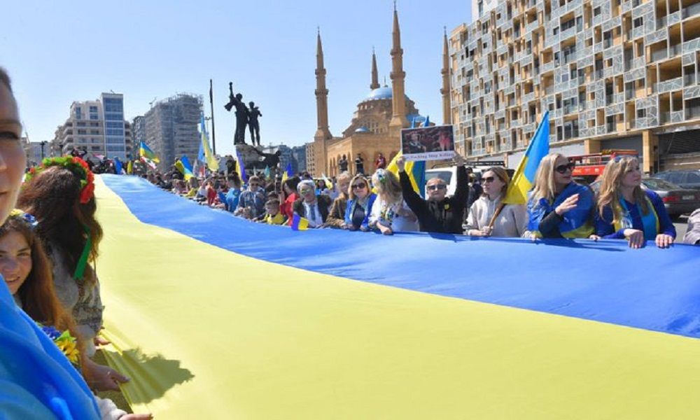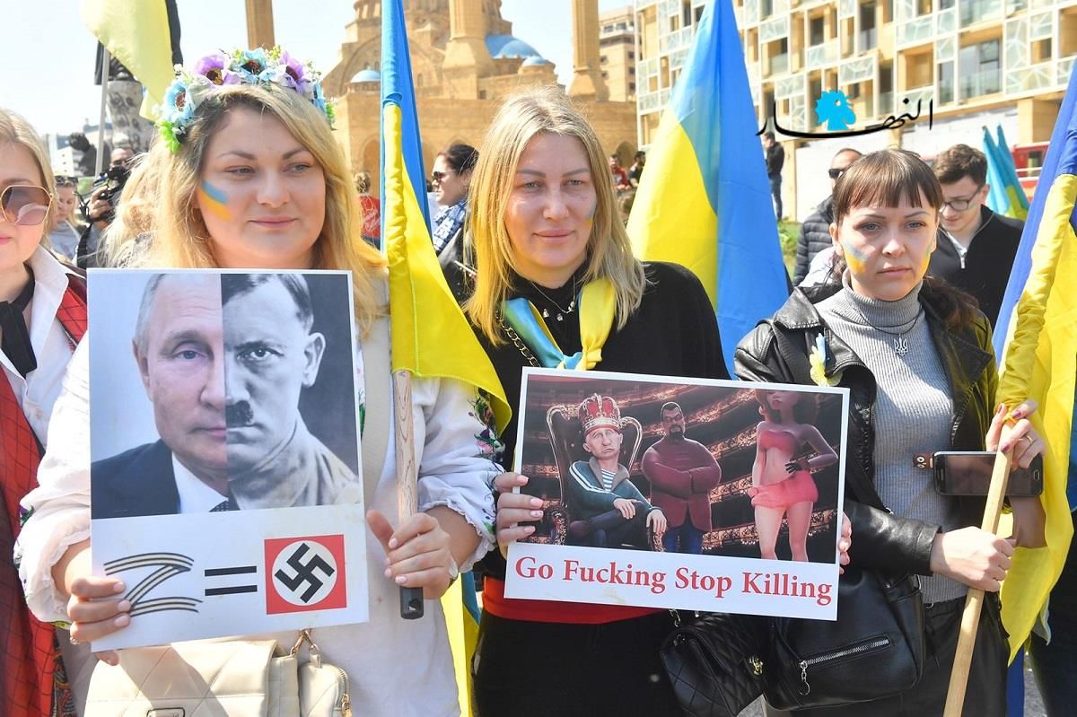 تظاهر العشرات من الجالية الأوكرانية في لبنان أمام تمثال الشهداء في بيروت، تنديداً بالغزو الروسيّ لبلادهم.