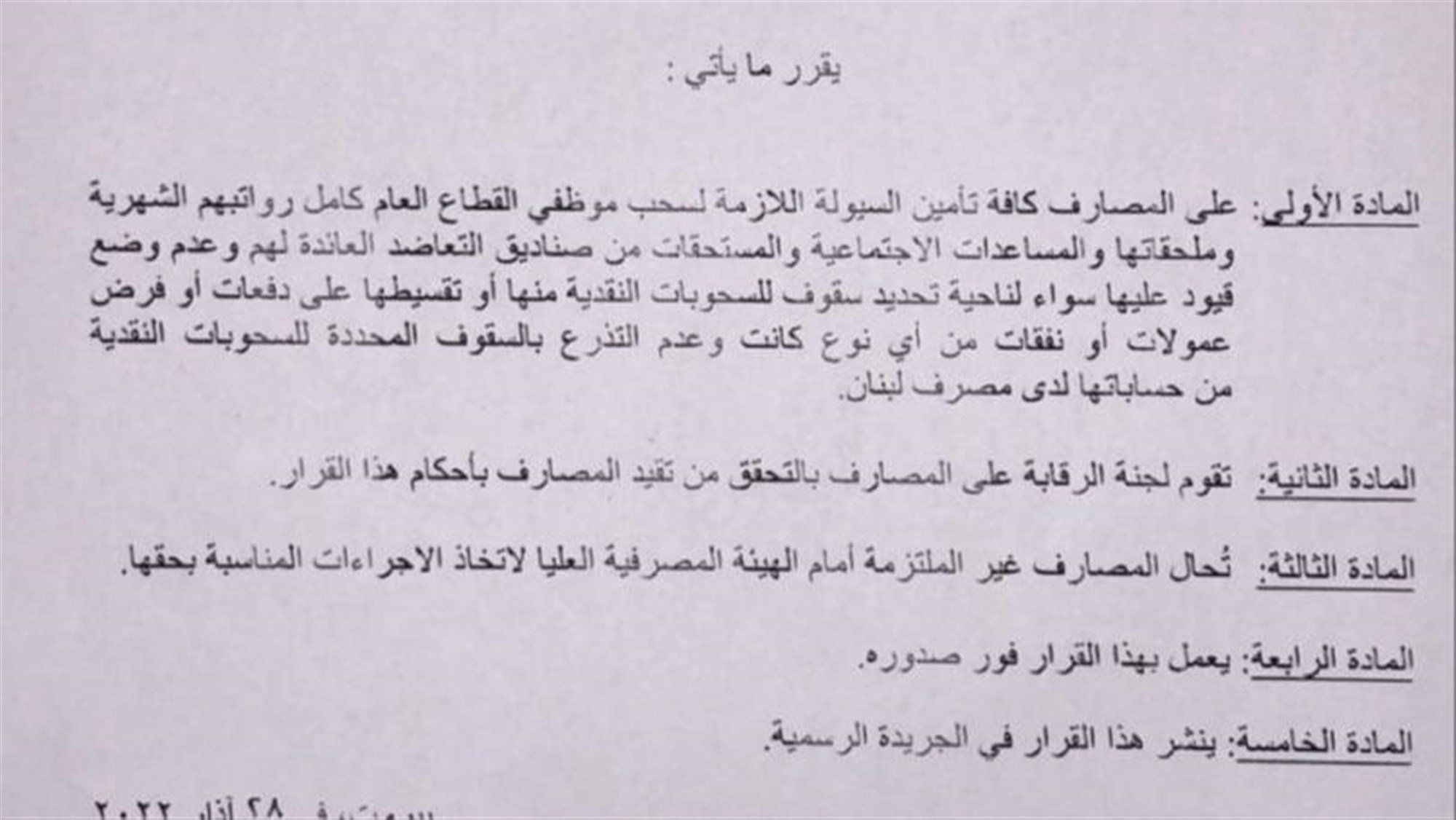 طلب “المركزي” من المصارف كافة تأمين السيولة اللازمة لسحب موظفي القطاع العام كل رواتبهم الشهرية وملحقاتها والمساعدات الاجتماعية والمستحقات من صناديق التعاضد العائدة لهم وعدم وضع قيود عليها لناحية تحديد سقوف للسحوبات النقدية منها أو تقسيطها على دفعات أو فرض عمولات أو نفقات من اي نوع كانت وعدم التذرع بالسقوف المحددة للسحوبات النقدية من حساباتها لدى مصرف لبنان.
