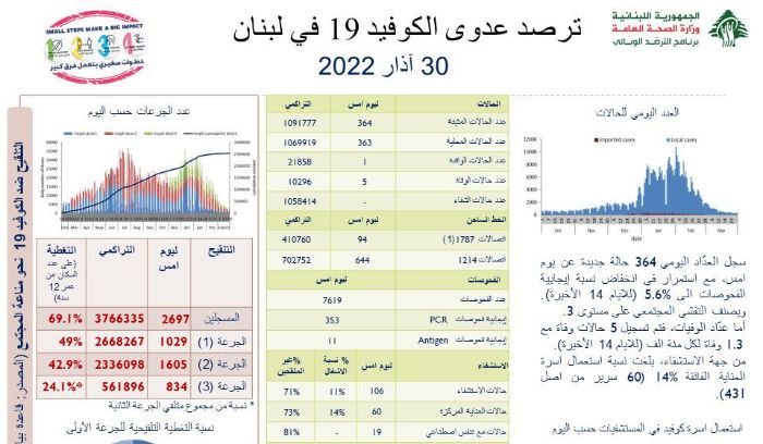 أعلنت وزارة الصحة العامة في تقريرها اليومي تسجيل 364 إصابة جديدة بفيروس كورونا رفعت العدد التراكمي للحالات المثبتة الى 1091777، كما تم تسجيل 5 حالات وفاة.