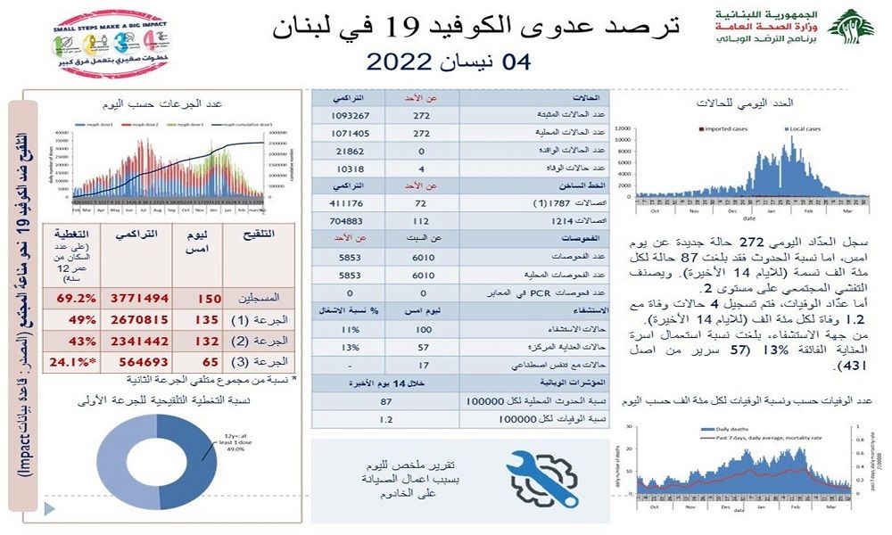 أعلنت وزارة الصحة العامة في تقريرها اليومي تسجيل 272 إصابة جديدة بفيروس كورونا رفعت العدد التراكمي للحالات المثبتة الى 1093267، كما تم تسجيل 4 حالات وفاة.
