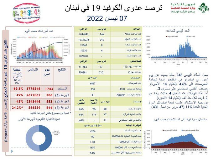 أعلنت وزارة الصحة العامة في تقريرها اليومي تسجيل “246 إصابة جديدة بفيروس كورونا رفعت العدد التراكمي للحالات المثبتة الى 1094096، كما تم تسجيل 4 حالات وفاة”.