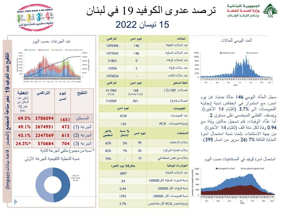 أعلنت وزارة الصحة العامة في تقريرها اليومي تسجيل “146 إصابة جديدة بفيروس كورونا رفعت العدد التراكمي للحالات المثبتة الى 1095406، كما تم تسجيل حالتي وفاة”.