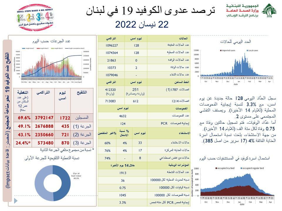 أعلنت وزارة الصحة العامة في تقريرها اليومي تسجيل “128 إصابة جديدة بفيروس كورونا رفعت العدد التراكمي للحالات المثبتة الى 1096227، كما تم تسجيل حالتي وفاة”.