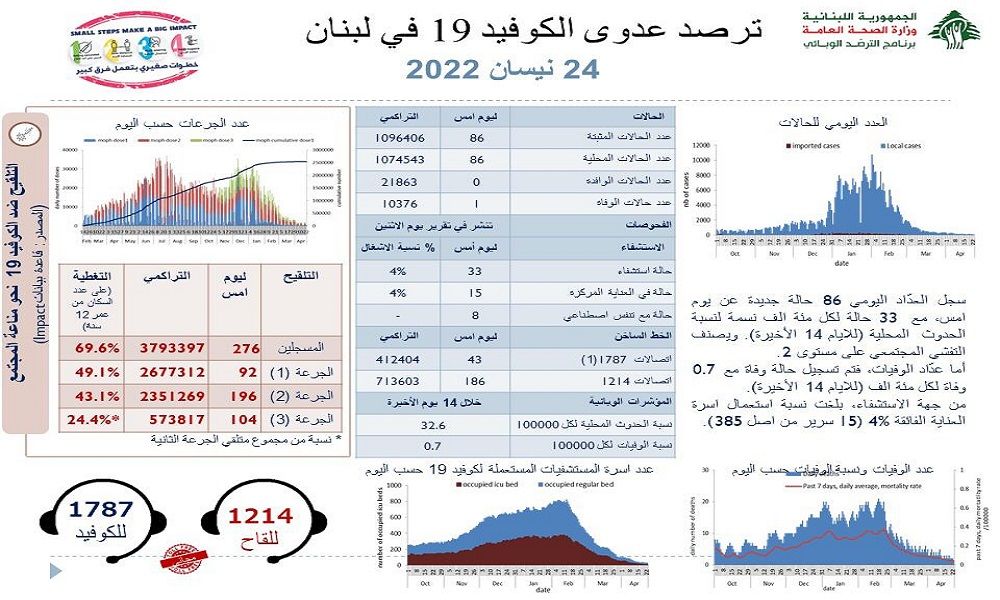 أعلنت وزارة الصحة العامة في تقريرها اليومي تسجيل 86 إصابة جديدة بفيروس كورونا رفعت العدد التراكمي للحالات المثبتة الى 1096406، كما تم تسجيل حالة وفاة واحدة.