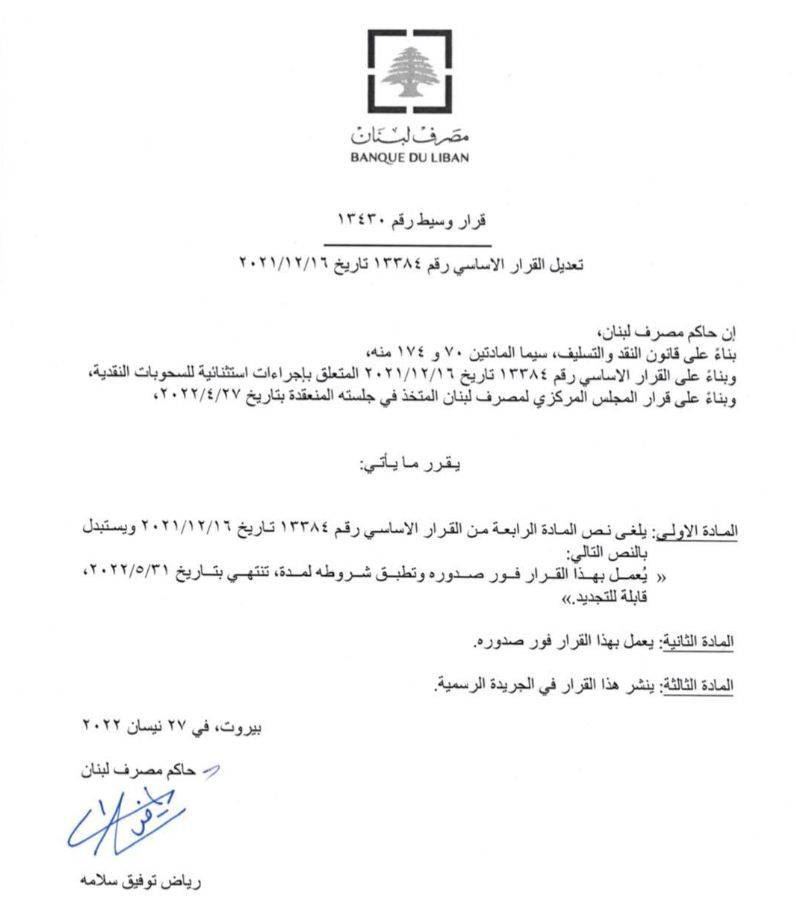 أصدر مصرف لبنان تعميما جديدا عن القرار الوسيط رقم 13430، يتعلّق بتعديل القرار الأساسي بشأن الإجراءات الاستثنائيّة للسحوبات النقديّة، المرفق بالتعميم الأساسي رقم 161.