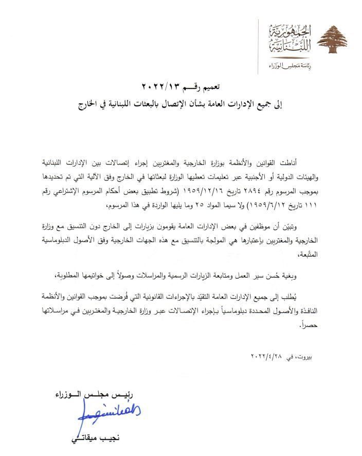 أصدر رئيس مجلس الوزراء نجيب ميقاتي تعميمًا موجّهًا إلى الإدارات العامة والمؤسسات العامة والبلديات حول الاتصال بالبعثات اللبنانية في الخارج والمنظمات الدولية، مطالبًا التقيد بالإجراءات القانونية التي فرضت بموجب القوانين والأنظمة النافذة والأصول المحدّدة ديبلوماسيًّا.