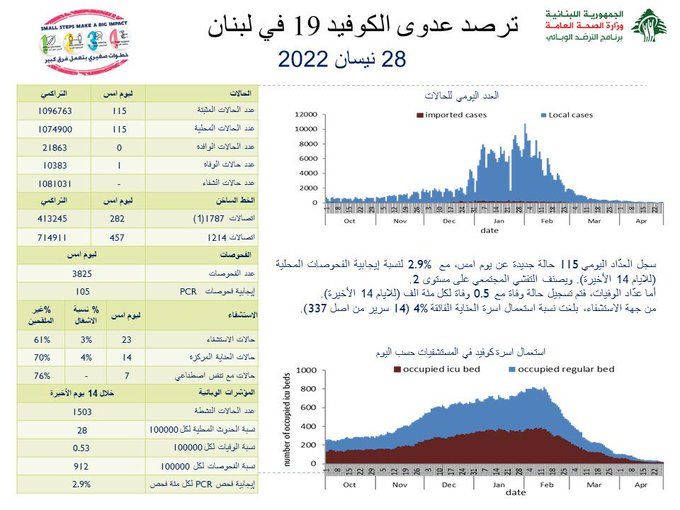 أعلنت وزارة الصحة العامة في تقريرها اليومي تسجيل “115 إصابة جديدة بفيروس كورونا رفعت العدد التراكمي للحالات المثبتة الى 1096763، كما تم تسجيل حالة وفاة واحدة”.
