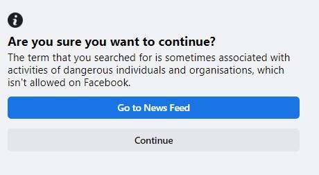 ويظهر عند البحث سؤال “هل أنت متأكد أنك تريد متابعة البحث؟” يضاف إلى السؤال شرح عن سبب السؤال وفيه: “التعبير أو الإسم الذي تبحث عنه يرتبط أحياناً بأعمال خطيرة يقوم بها أفراد ومنظمات وهو أمر غير مسموح على فيسبوك”.