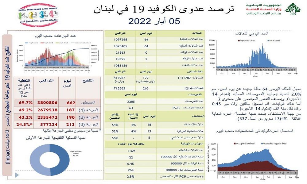أعلنت وزارة الصحة العامة في تقريرها اليومي تسجيل 64 إصابة جديدة بفيروس كورونا رفعت العدد التراكمي للحالات المثبتة الى 1097268، كما تم تسجيل حالتي وفاة.