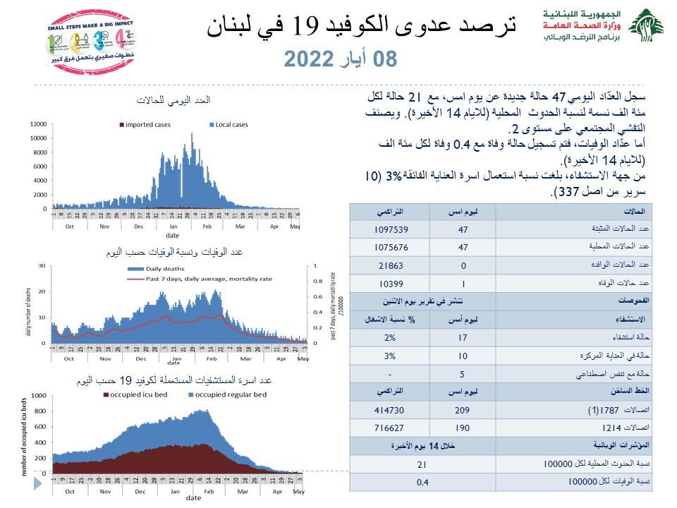 أعلنت وزارة الصحة العامة في تقريرها اليومي تسجيل 47 إصابة جديدة بفيروس كورونا رفعت العدد التراكمي للحالات المثبتة الى 1097539، كما تم تسجيل حالة وفاة واحدة.