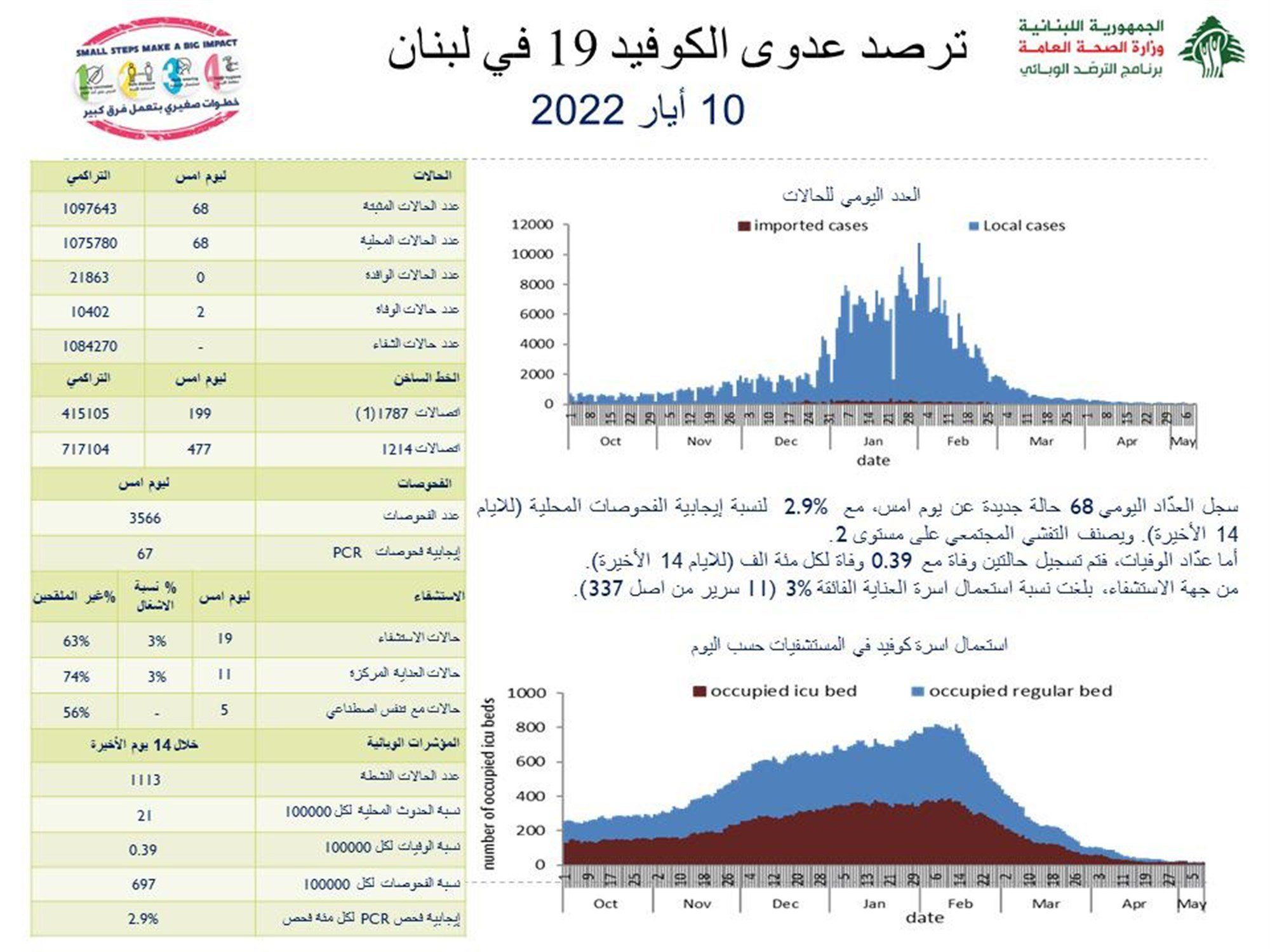 أعلنت وزارة الصحة العامة تسجيل 68 إصابة جديدة بفيروس “كورونا” في لبنان، ما يرفع العدد الإجمالي للمصابين إلى 1097643. كما أعلنت تسجيل حالتي وفاة جديدة بالفيروس ترفع الحصيلة الإجمالية للمتوفين إلى 10402.