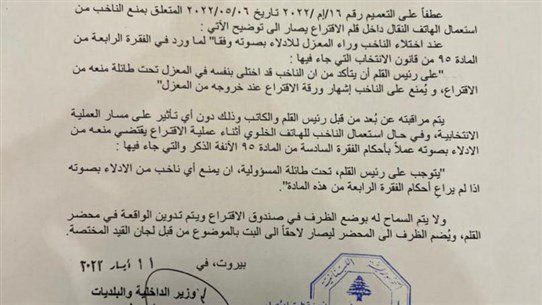 منع وزير الداخلية بسام مولوي، في تعميم، استعمال الهاتف داخل قلم الاقتراع، تحت طائلو منعه من الادلاء بصوته. وتتابعون التفاصيل في الصورة ادناه.
