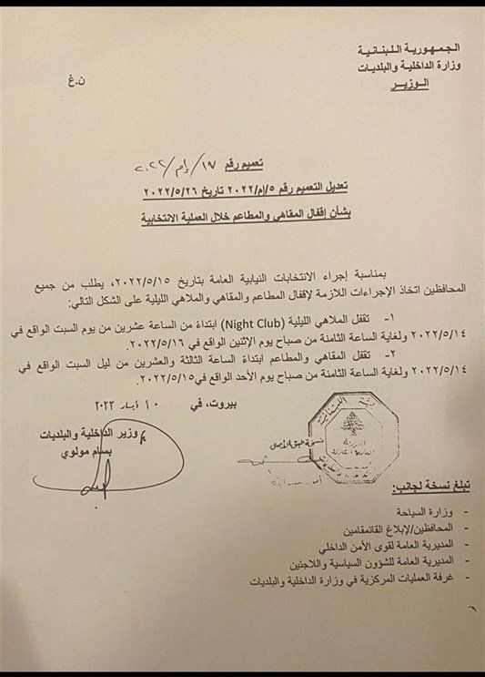 صدر عن وزير الداخلية والبلديات بسام مولوي بيان عن تعديل التعميم بشأن توقيت إقفال المقاهي والمطاعم خلال العمليّة الإنتخابيّة، تجدونه مرفقاً بالخبر.