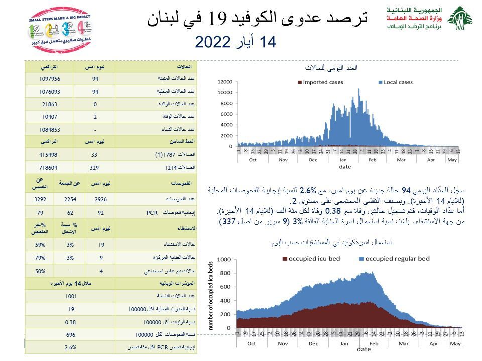 أعلنت وزارة الصحة العامة في تقريرها اليومي تسجيل” 94 إصابة جديدة بفيروس كورونا رفعت العدد التراكمي للحالات المثبتة الى 1097956، كما تم تسجيل حالتي وفاة”.