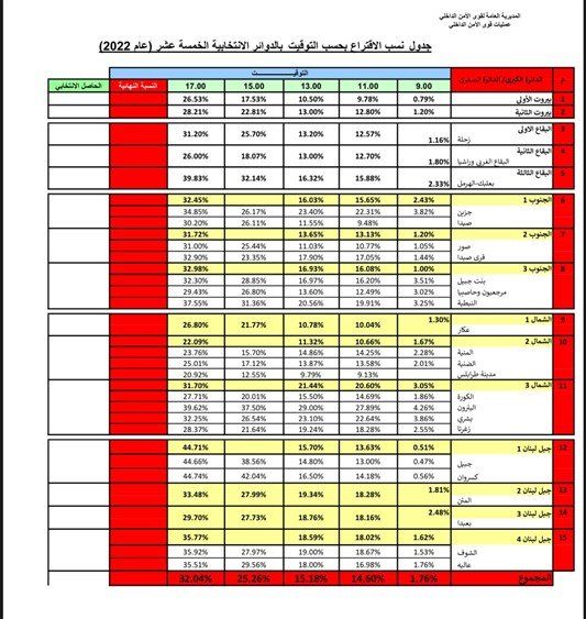 بلغت نسبة الاقتراع حتى الساعة الخامسة بعد الظهر 32.04 في المئة، وفق وزارة الداخلية والبلديات.