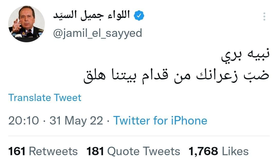 غرّد النائب جميل السّيّد عبر تويتر مُتوّجهًا إلى رئيس مجلس النواب بالقول: “نبيه بري، ضبّ زعرانك من قدّام بيتنا هلّق”.