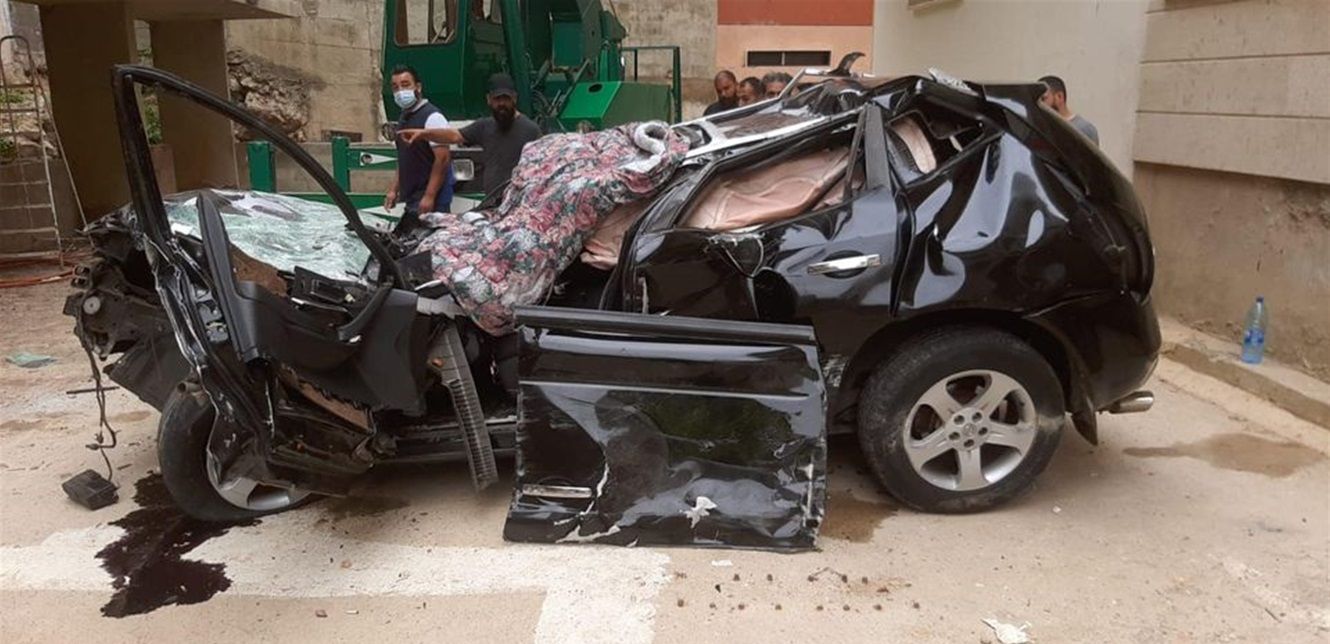 عمل عناصر من الدفاع المدني على سحب جثة مواطنة باستعمال معدات الانقاذ الهيدروليكية من داخل سيارتها رباعية الدفع بسبب تضرر هيكلها بشدة جراء قوة الحادث الذي وقع في خلدة-عالية.