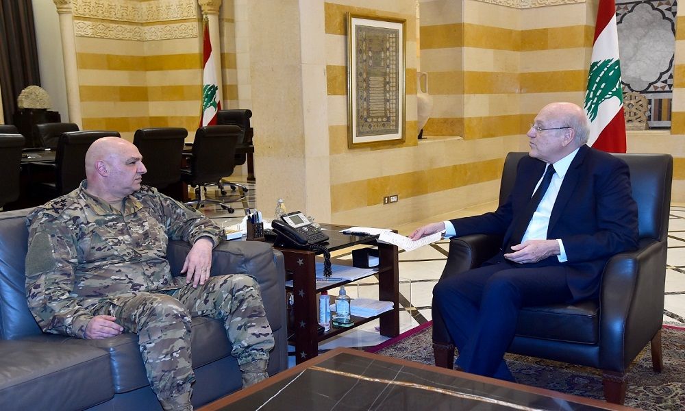 عرض رئيس الحكومة نجيب ميقاتي مع قائد الجيش العماد جوزيف عون بعد ظهر اليوم في السراي الحكومي أوضاع المؤسسة العسكرية.