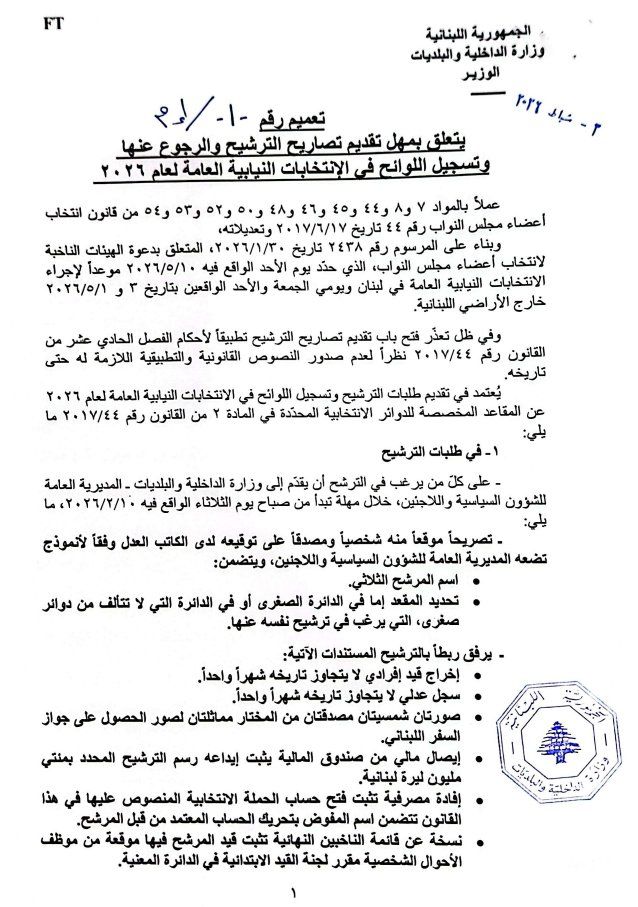 صدر عن وزير الداخلية والبلديات أحمد الحجار، تعميم حدّد فيه مهل تقديم تصاريح الترشيح والرجوع عنها، وتسجيل اللوائح للانتخابات النيابية العامة لعام 2026.