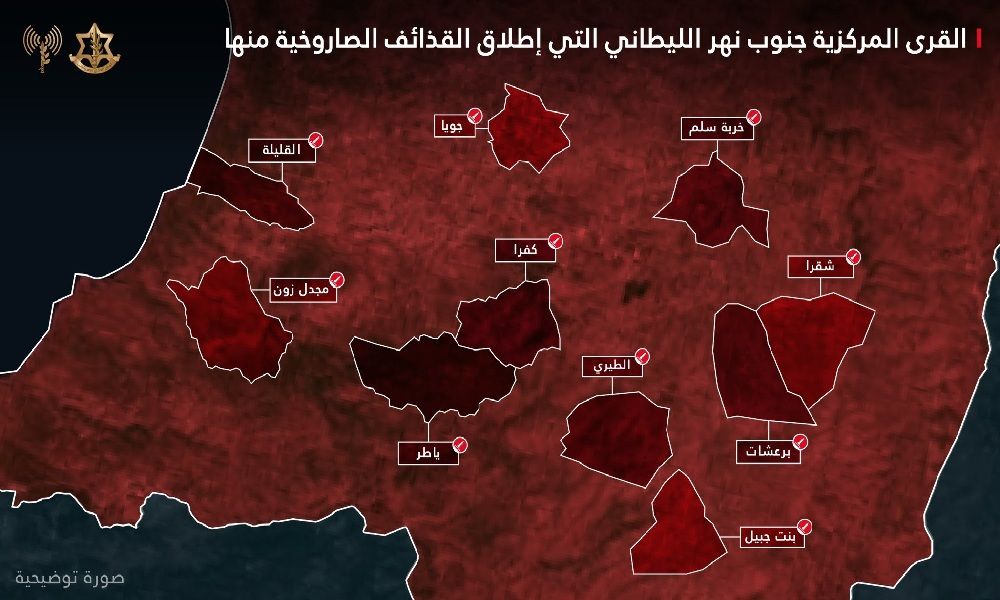 وأضاف أن حزب الله أطلق منذ بداية الحرب نحو 3000 قذيفة صاروخية وصاروخ من تلك المنطقة، لافتا إلى أن عددا من القرى الجنوبية استُخدمت، بحسب قوله، منصات لإطلاق الصواريخ، من بينها ياطر، القليلة، كفرا، برعشيت، جويا، خربة سلم، الطيري، شقرا، مجدل زون وبنت جبيل.
