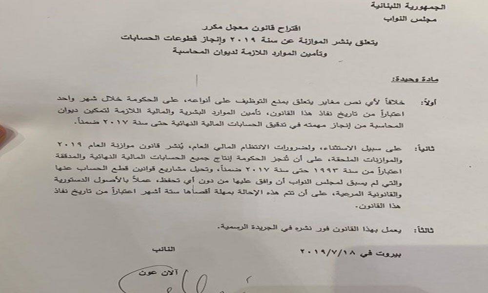 ثانيا: على سبيل الاستثناء، ولضرورات الانتظام المالي العام، ينشر قانون موازنة العام 2019 والموازنات الملحقة، على أن تنجز الحكومة إنتاج جميع الحسابات المالية النهائية والمدققة اعتبارا من سنة 1993 حتى سنة 2017 ضمنا، وتحيل مشاريع قوانين قطع الحساب عنها والتي لم يسبق لمجلس النواب أن وافق عليها من دون أي تحفظ، عملا بالأصول الدستورية والقانونية المرية، طى أن تتم هذه الإحالة بمهلة أقصاها ستة اشهر اعتبارأ من تاريخ نفاذ هذا القانون،