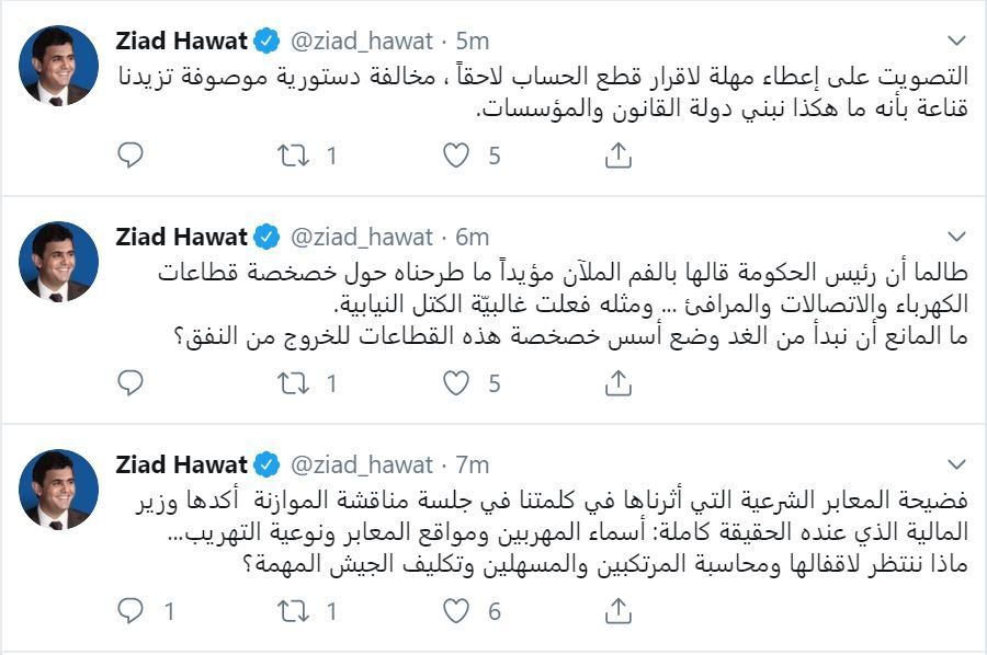 وختم: “التصويت على إعطاء مهلة لاقرار قطع الحساب لاحقا مخالفة دستورية موصوفة تزيدنا قناعة بأنه ما هكذا نبني دولة القانون والمؤسسات”.