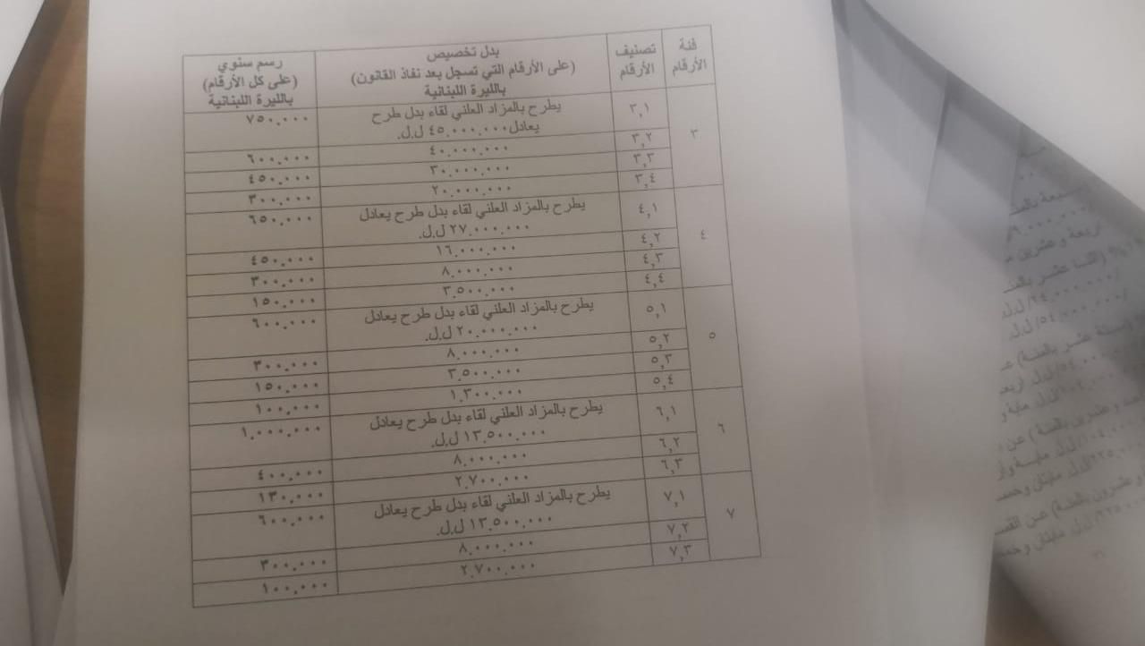 أقرّ مجلس النواب رسمًا سنويًا مقطوعًا على لوحات السيارات ذات الأرقام المميزة يتراوح بين رسم أعلى 750 ألف وأدنى يبلغ 100 ألف ليرة. وتجدون في الصورة المرفقة الرسوم المختلفة.