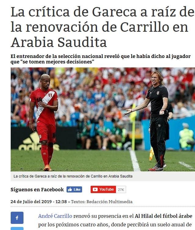 وضع تجديد أندري كاريو عقده مع الهلال، ريكاردو غاريكا مدرب منتخب بيرو في ورطة، بسبب بعد المسافة بين البلدين وهو ما قد يؤثر على وصول اللاعب الملقب بـ"الثعبان" إلى معسكرات المنتخب في الوقت المناسب.