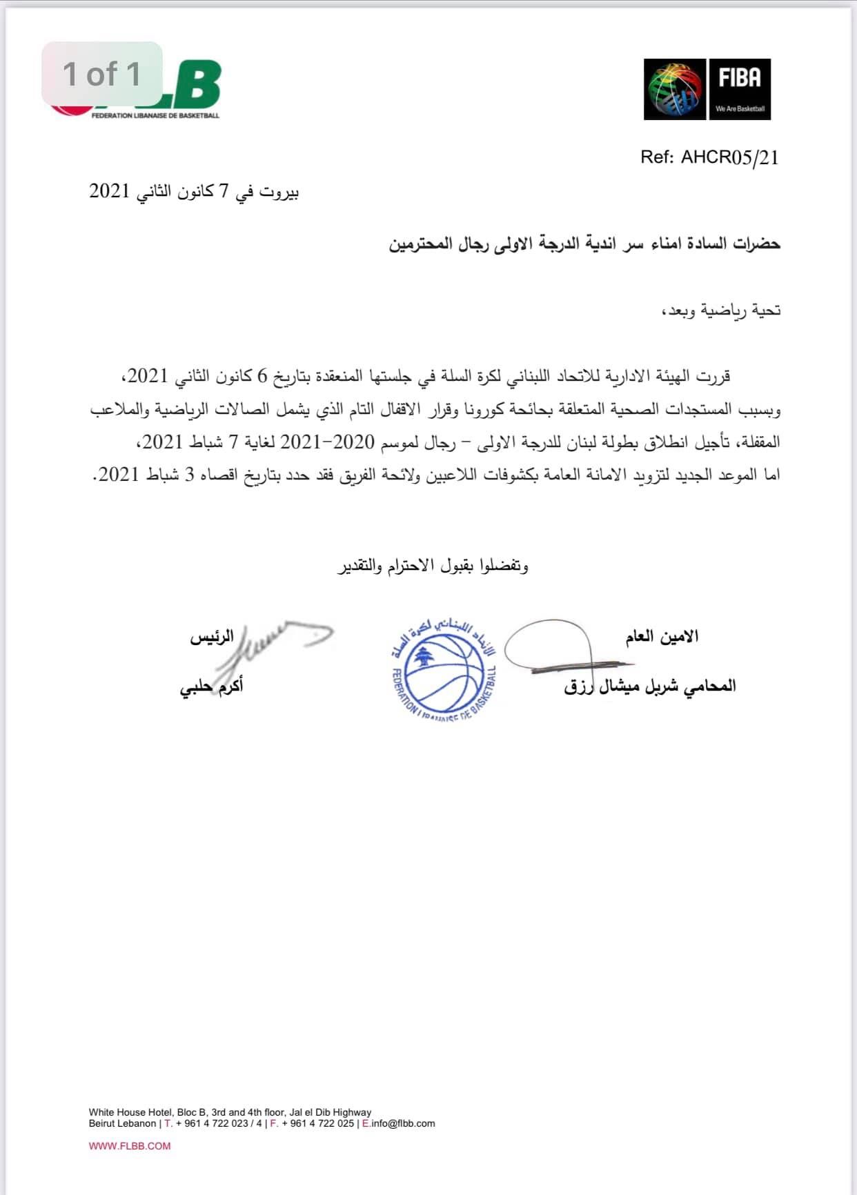 قررت الهيئة الإدارية للاتحاد اللبناني لكرة السلة، في جلسة عقدتها الخميس، إطلاق بطولة لبنان لكرة السلة موسم 2020-2021 في 7 شباط المقبل، وذلك بسبب المستجدات الصحية المتعلقة بجائحة “كورونا” وقرار الإقفال التام الذي يشمل الصالات الرياضية والملاعب المغلقة.