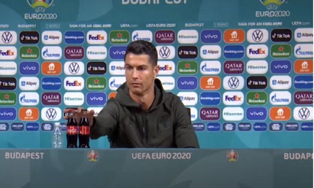 تزامن إبعاد نجم المنتخب البرتغالي كريستيانو رونالدو، لزجاجتي “كوكاكولا”، خلال مؤتمر صحفي قبل لقاء منتخب بلاد وهنغاريا في بطولة أمم أوروبا 2020، مع تسجيل انخفاض قدره 4 مليارات دولار في أسعار أسهم شركة المشروبات الغازية العملاقة.